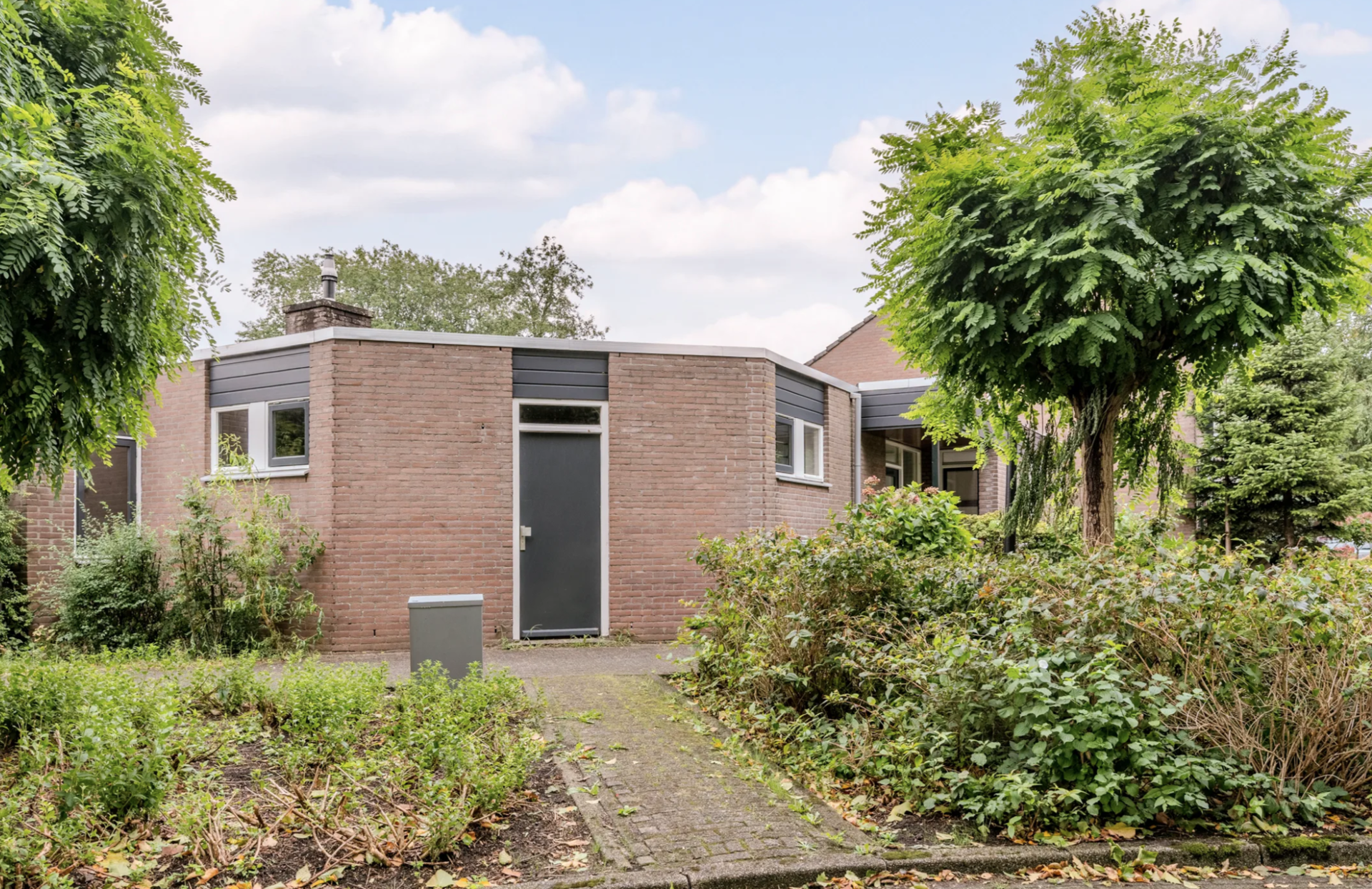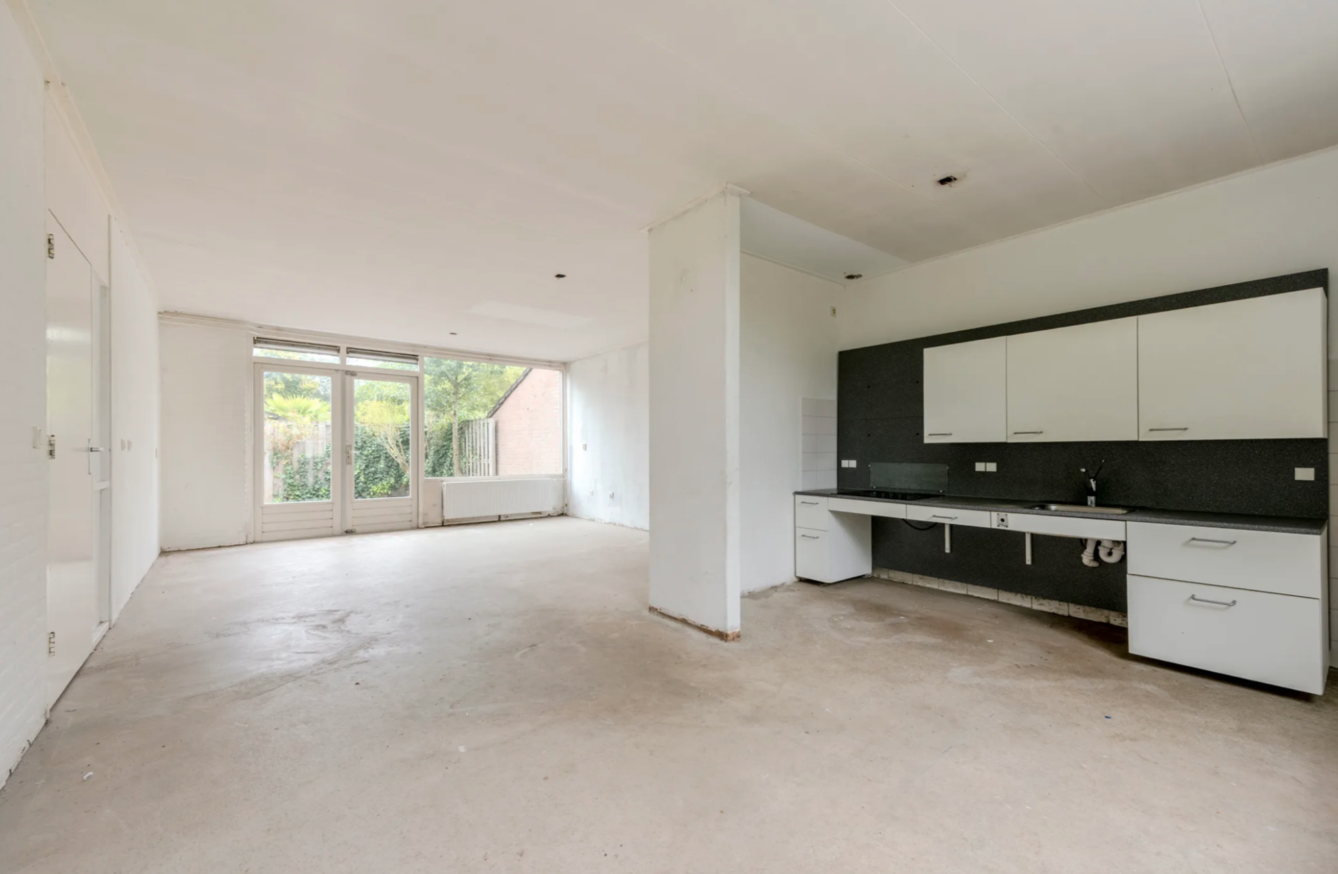 Via de voortuin komen we bij de woning. De woning is geheel gelijkvloers en heeft een praktische en overzichtelijke indeling. Via de entree kom je in een ruime hal die toegang geeft tot de verschillende vertrekken. Aan de voorzijde bevindt zich de keuken met aansluitend ruimte voor een eethoek. De keuken is eenvoudig ingericht en biedt mogelijkheden voor modernisering of het plaatsen van een geheel nieuwe keuken naar eigen smaak. De woonkamer is royaal en heeft grote ramen en openslaande deuren naar het terras, waardoor er veel lichtinval is en een fijn contact met buiten. De indeling biedt ruimte voor zowel een gezellige zithoek als een aparte eethoek.