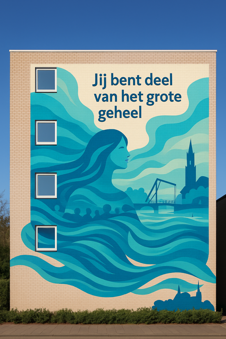 Als u straks vanaf de A2 IJsselstein inrijdt, kunt u dit niet missen: de gevelkunst van Natasja Fokke. Begin 2026 wordt de zijgevel van een wooncomplex van Cazas Wonen aan de Italiëlaan van kunst voorzien. Het initiatief kwam van kunstenares Natasja Fokke; Cazas Wonen omarmde het idee en maakt het, samen met de gemeente IJsselstein, mogelijk. Begin oktober konden bewoners hun voorkeur aangeven, en het thema “Jij bent deel van het grote geheel” sprak hen het meest aan. Op de illustratie zijn ook de ophaalbrug aan de Poortdijk en de Sint Nicolaasbasiliek te zien.