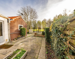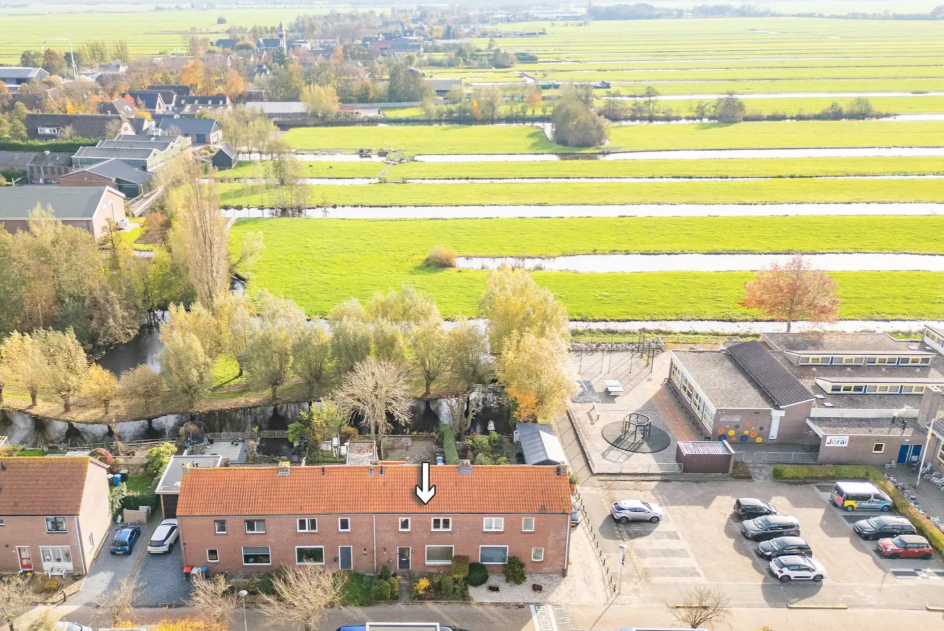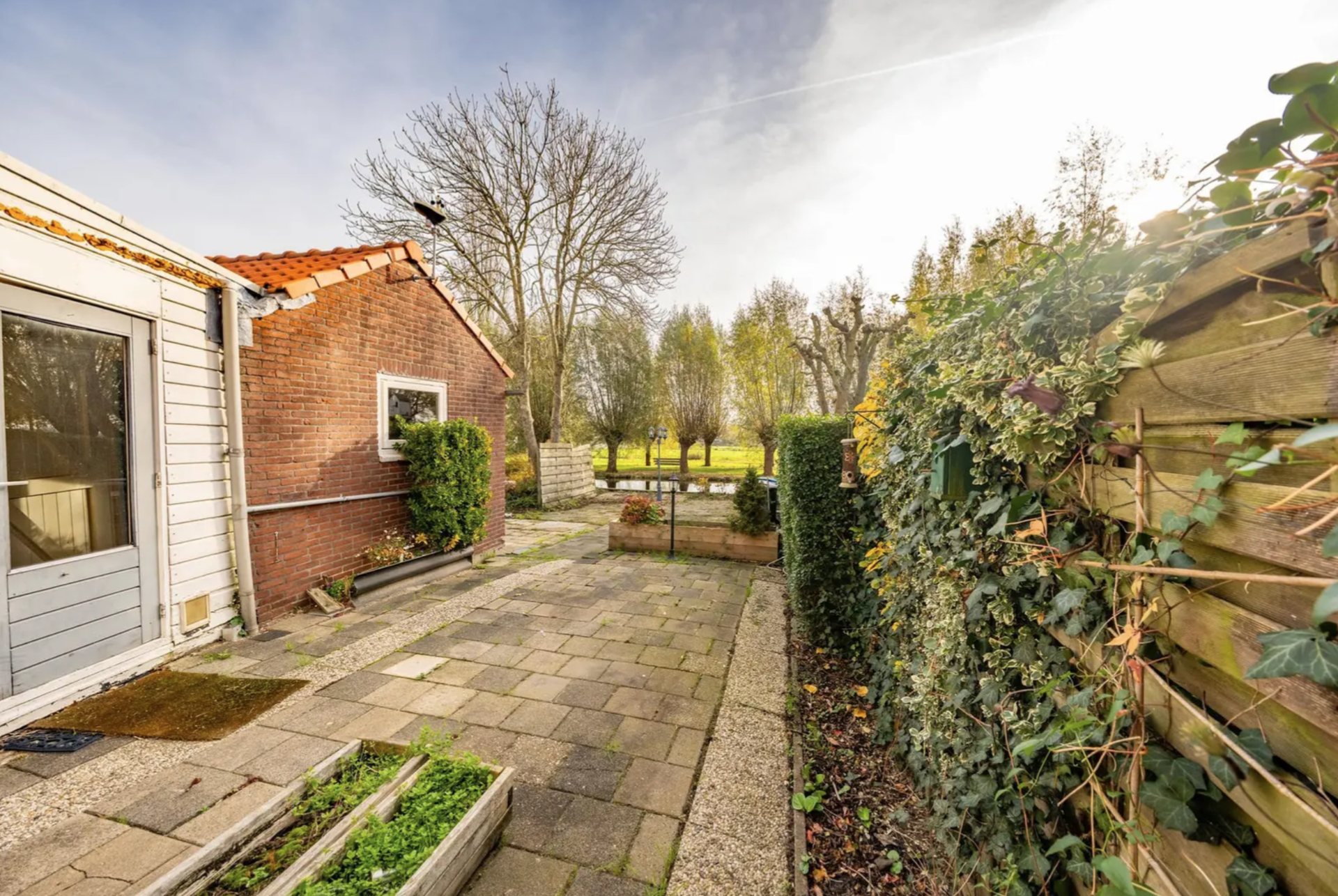 Voortuin, voordeur, entree/hal, trapkast. Trapopgang en een toiletruimte. Woonkamer met vaste kasten en voor-en achter een groot lichtkozijn. Halfopen keuken in hoekopstelling. De keukendeur geeft toegang tot een tussenhal/bijkeuken en met deur naar achterom. Inpandige doorgang naar de schuur. De woning staat op een riant perceel van circa 200 m2 (nog nader door het Kadaster laten uitmeten) en grenzend aan een sloot. Met zo’n groot perceel is er altijd een plek in de zon of schaduw te vinden en maakt het niet uit waar de zon vandaan komt. Op het dak liggen alvast 8 zonnepanelen.